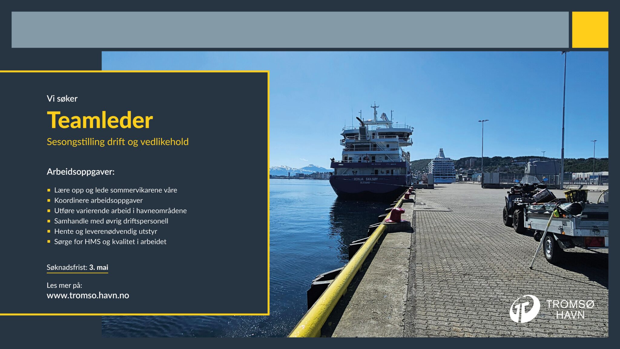 Du vil få ansvar for å lede og koordinere daglige oppgaver knyttet til drift og vedlikehold på våre havneområder i sentrum, Breivika og på Grøtsund.